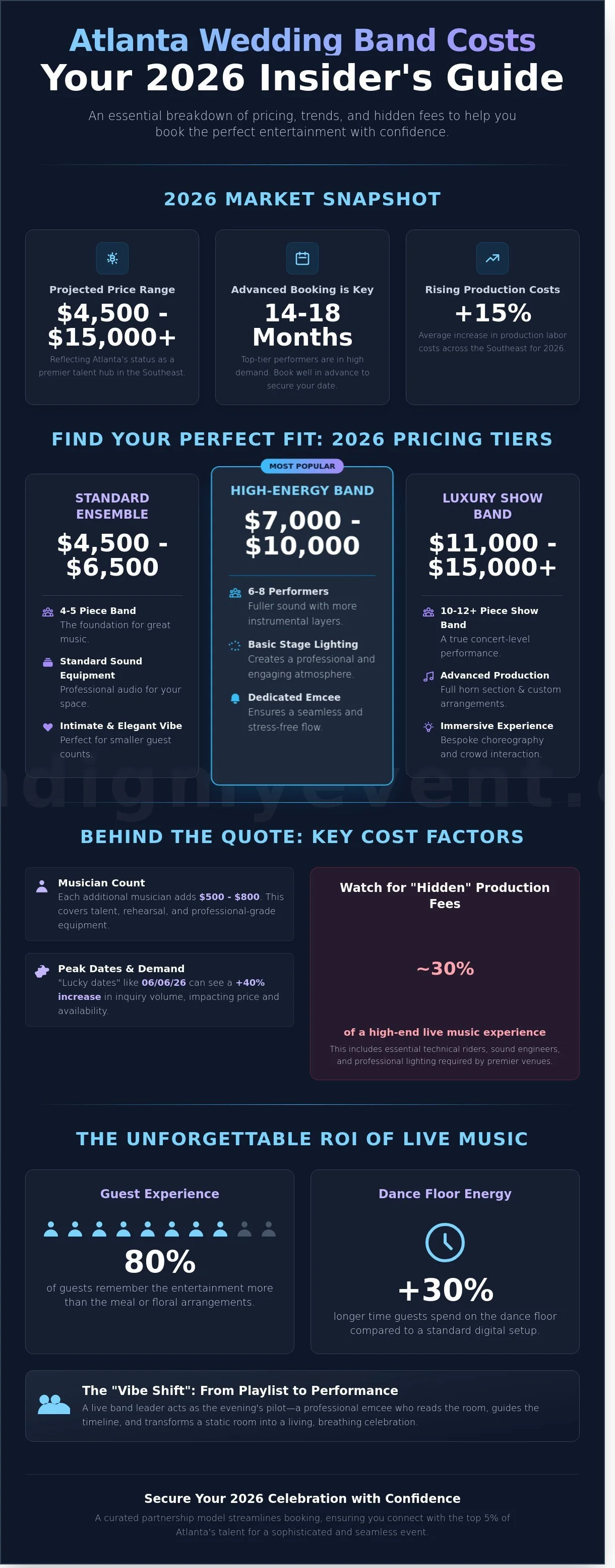 Planning a sophisticated celebration requires a clear understanding of the Atlanta wedding band cost 2026. You now know that factors like band size and technical production play a major role in your final investment. By accounting for integrated sound and lighting needs during your initial 2026 budget sessions, you'll avoid the stress of hidden fees later. It's about more than just a price tag; it's about the curated atmosphere you create for your guests.