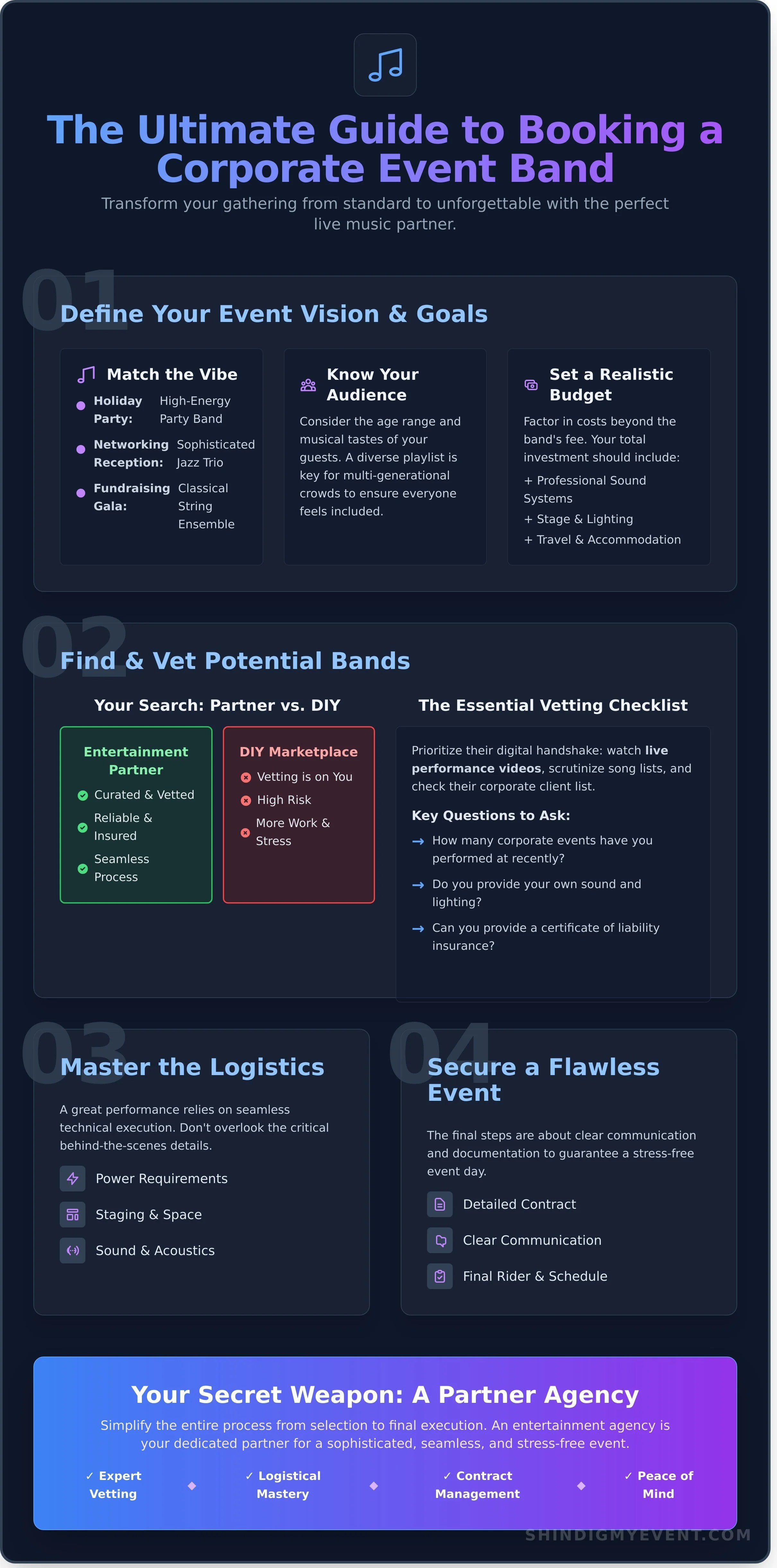 As your partner in live music and production, the team at Shindig My Event manages these logistics to create an unforgettable and effortless experience.